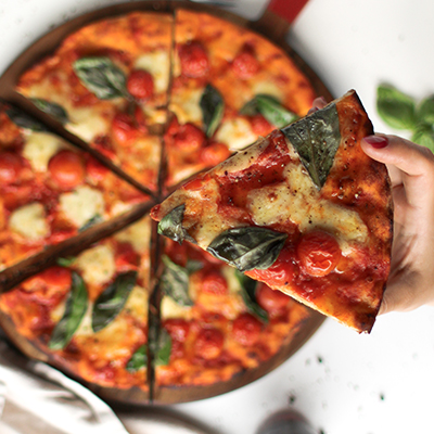 Para nuestras pizzas, además de la muzzarella clásica, ofrecemos como opción vegana una muzzarella de origen vegetal elaborada en nuestra casa. libre de gluten.